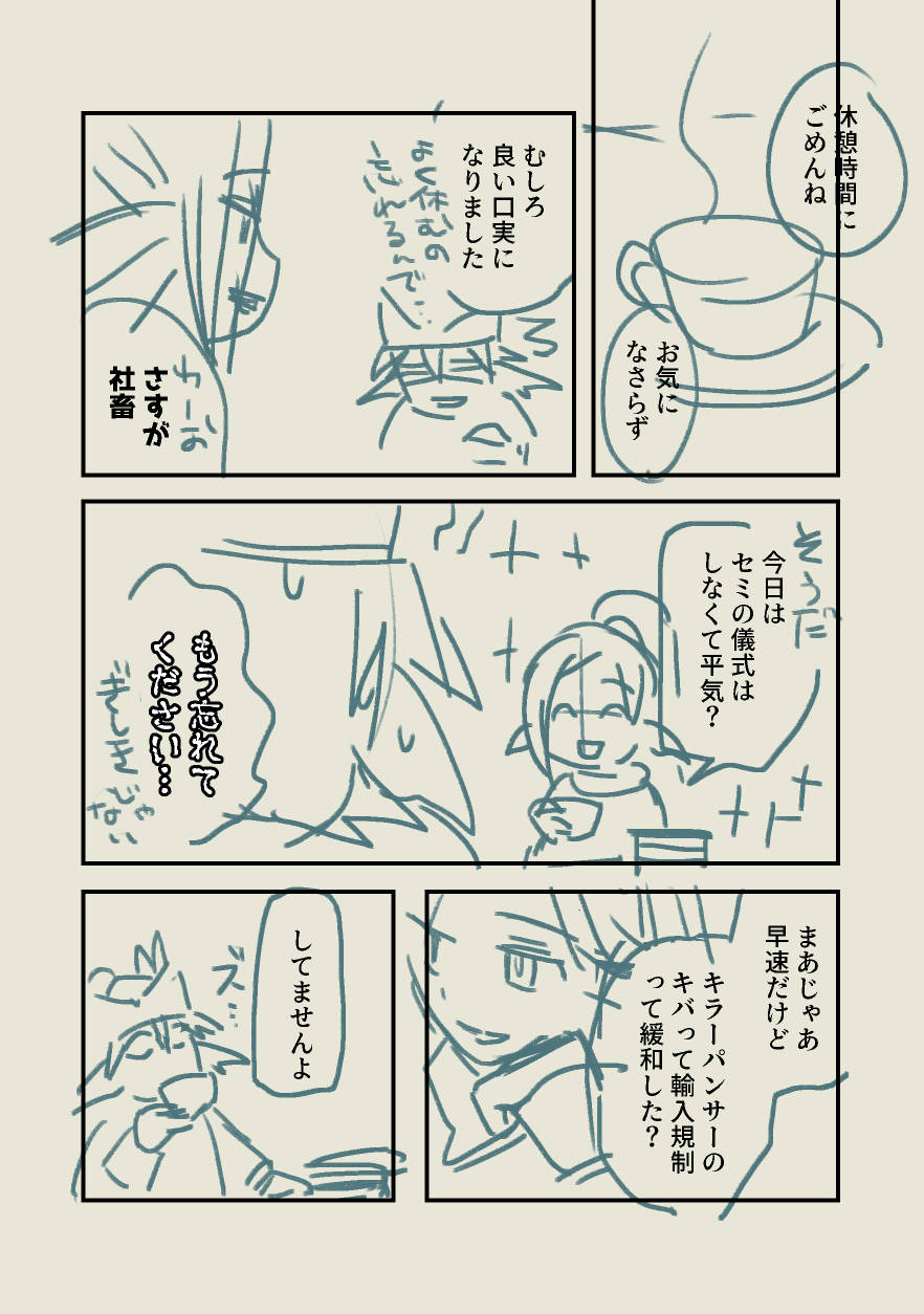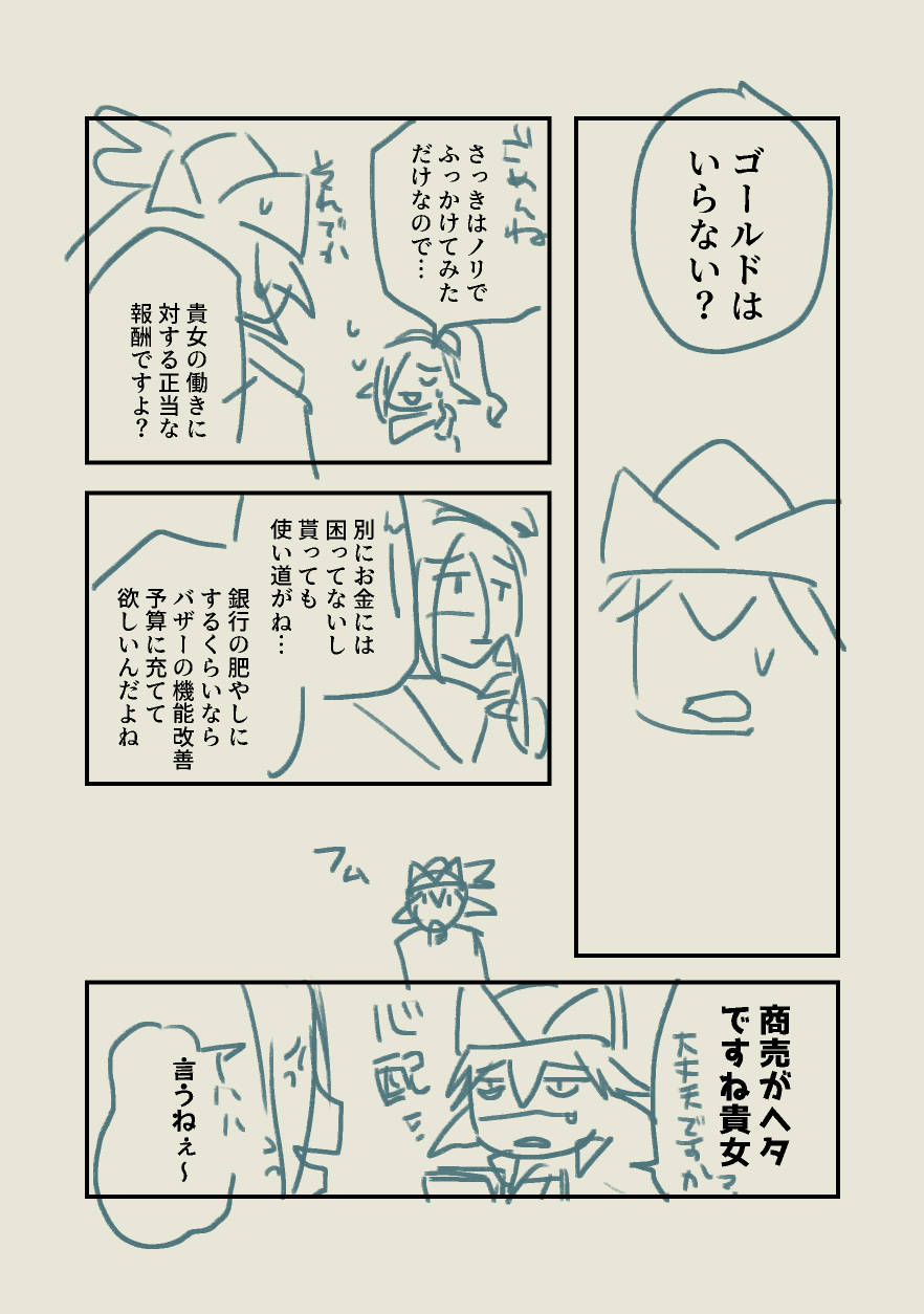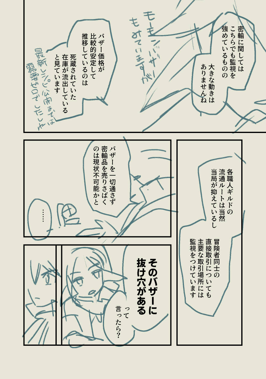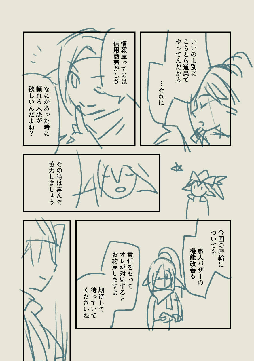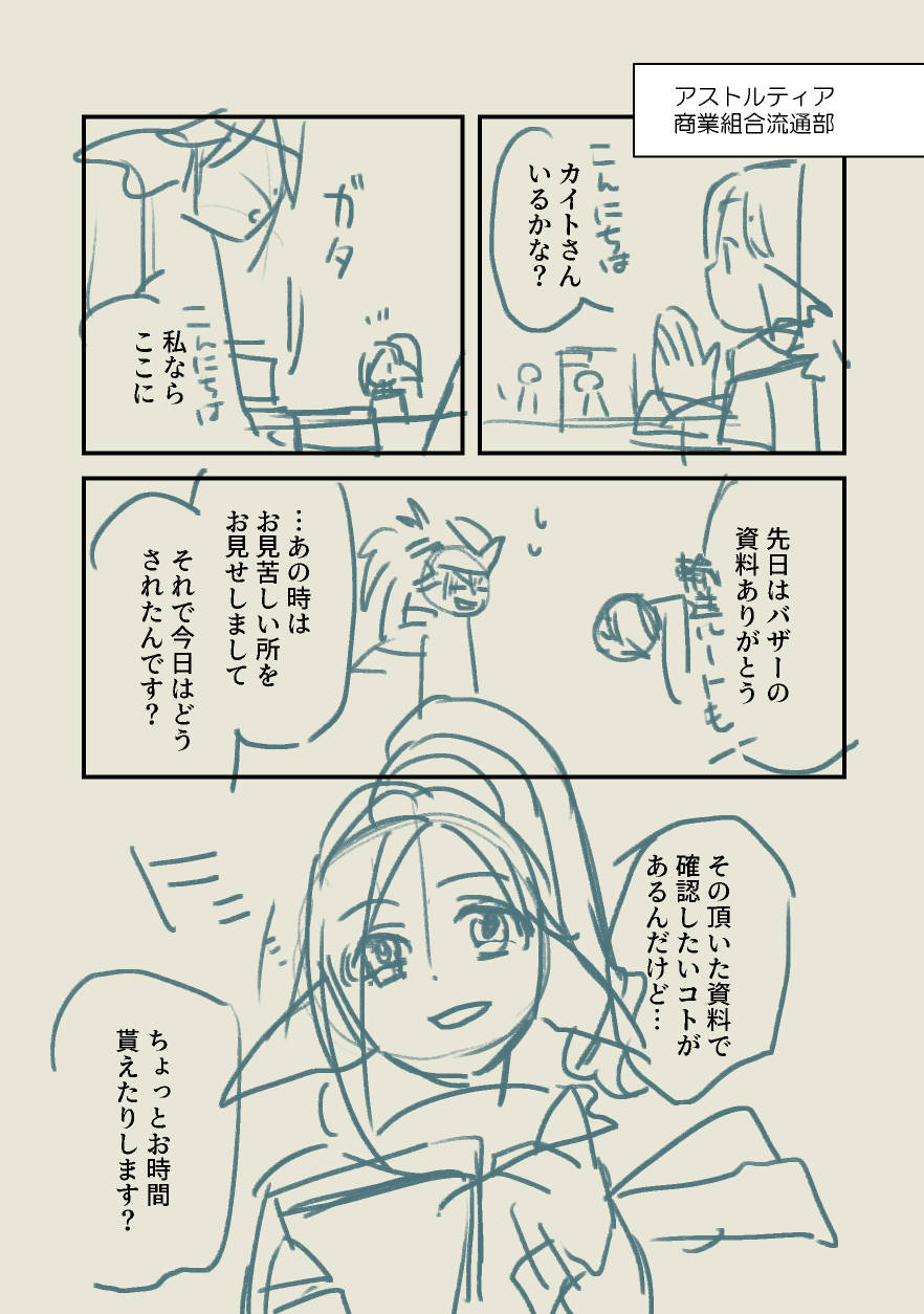 うちよそ交流でココットールさんとカイト描かせてもらいました!情報屋のココさん、ネタ集めにバザーの相場変動データ諸々をカイトにもらいにいった時の話。「あれ?今記録されてるのこれだけ?」「嵐で船がまだ到着してなくて。大量の荷物は海輸頼みですからね。私も胃が痛いです。」後で書類↓ https://t.co/1SsCACWZP7 pic.twitter.com/SVs7SpBQls